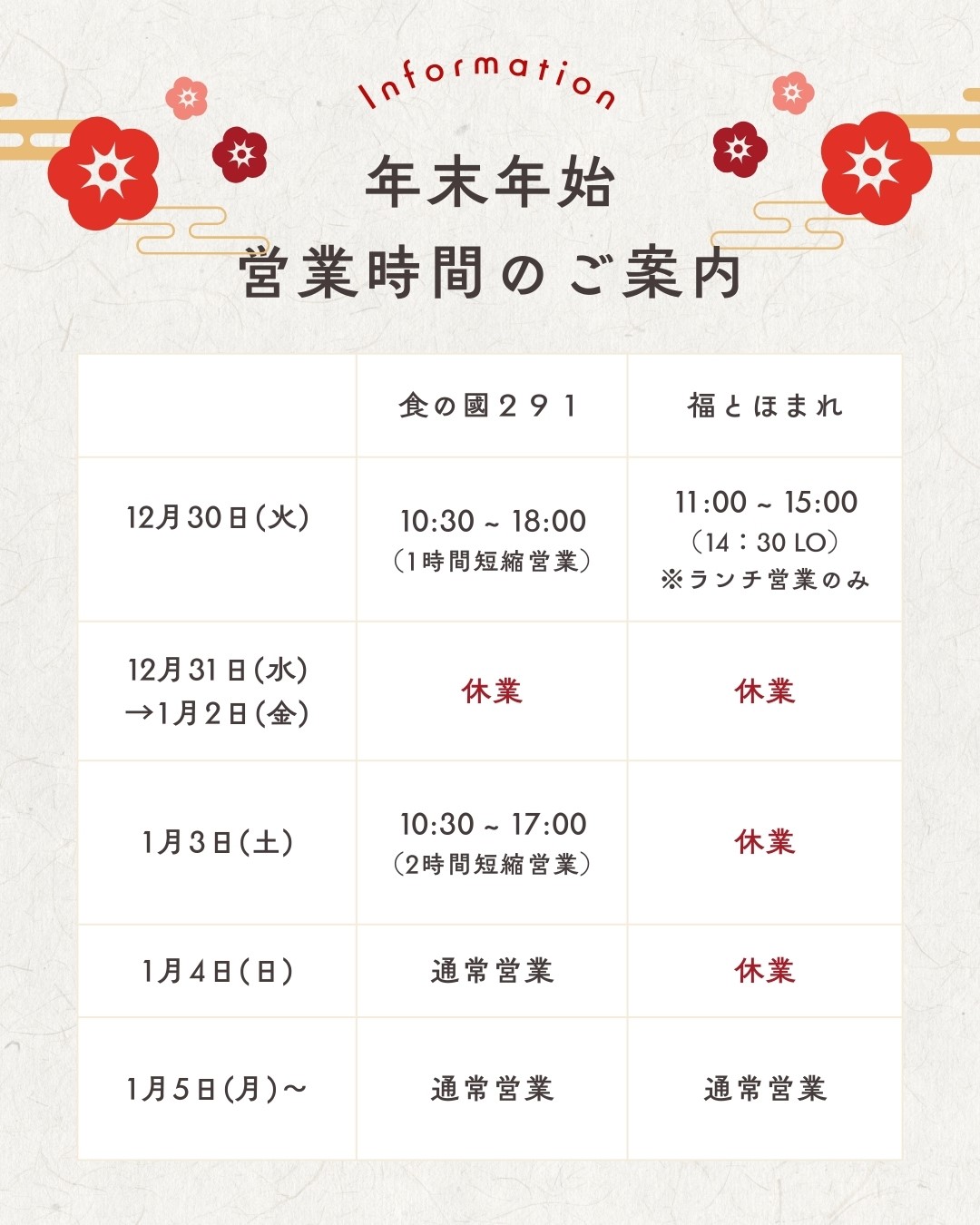 2025年12月30日(火)11:00~15:00(LO14:30) ランチ営業のみ