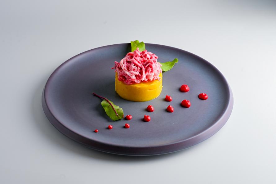永平寺町産の里芋に、蟹とビーツを重ねたペルーの伝統料理「カウサ」。