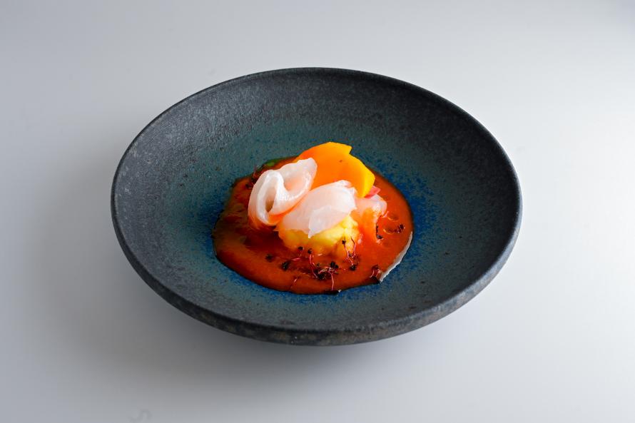 越前の海と柿の果実、ロトコ唐辛子と柚子果汁の爽やかな酸味が奏でる軽やかさ。