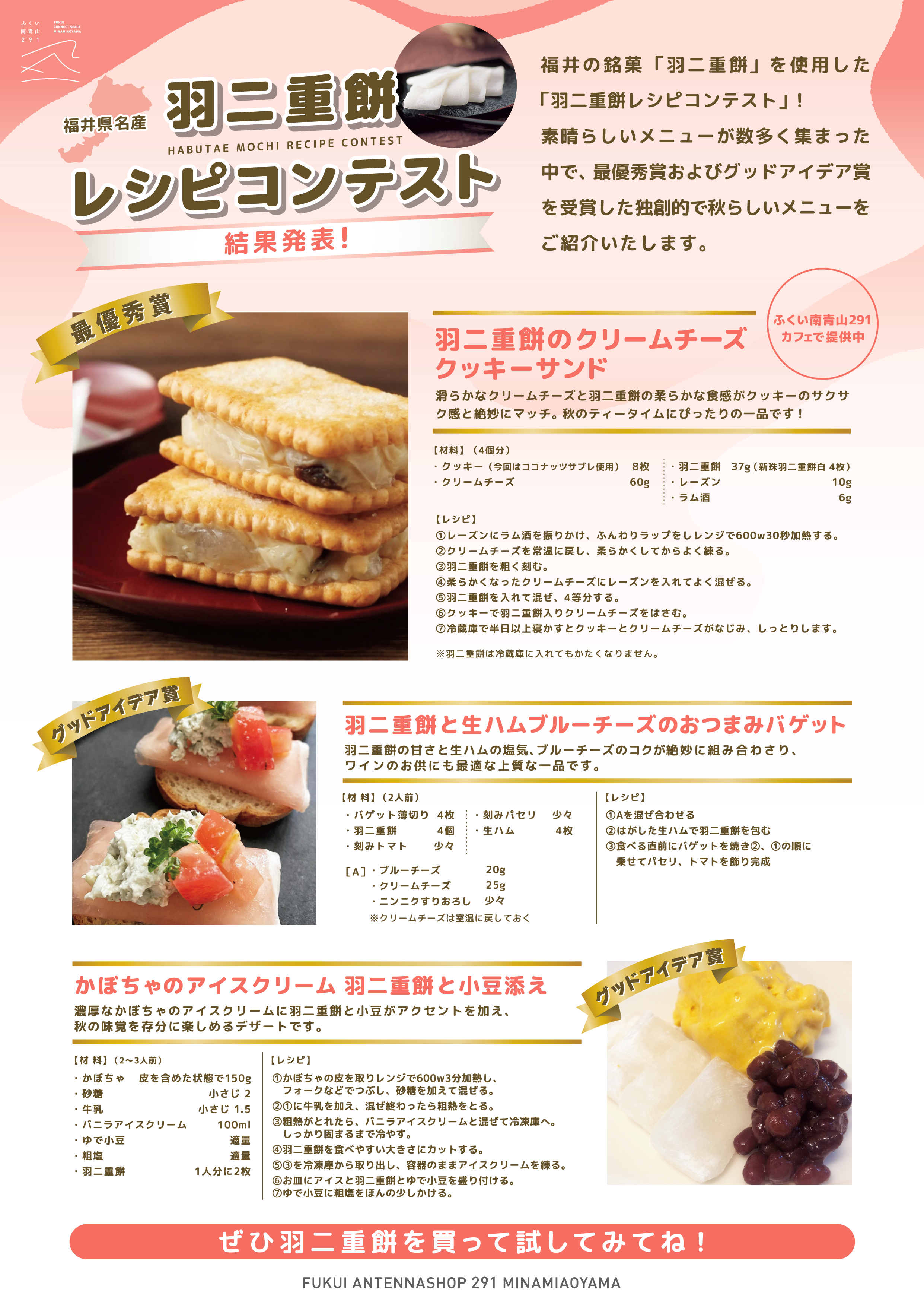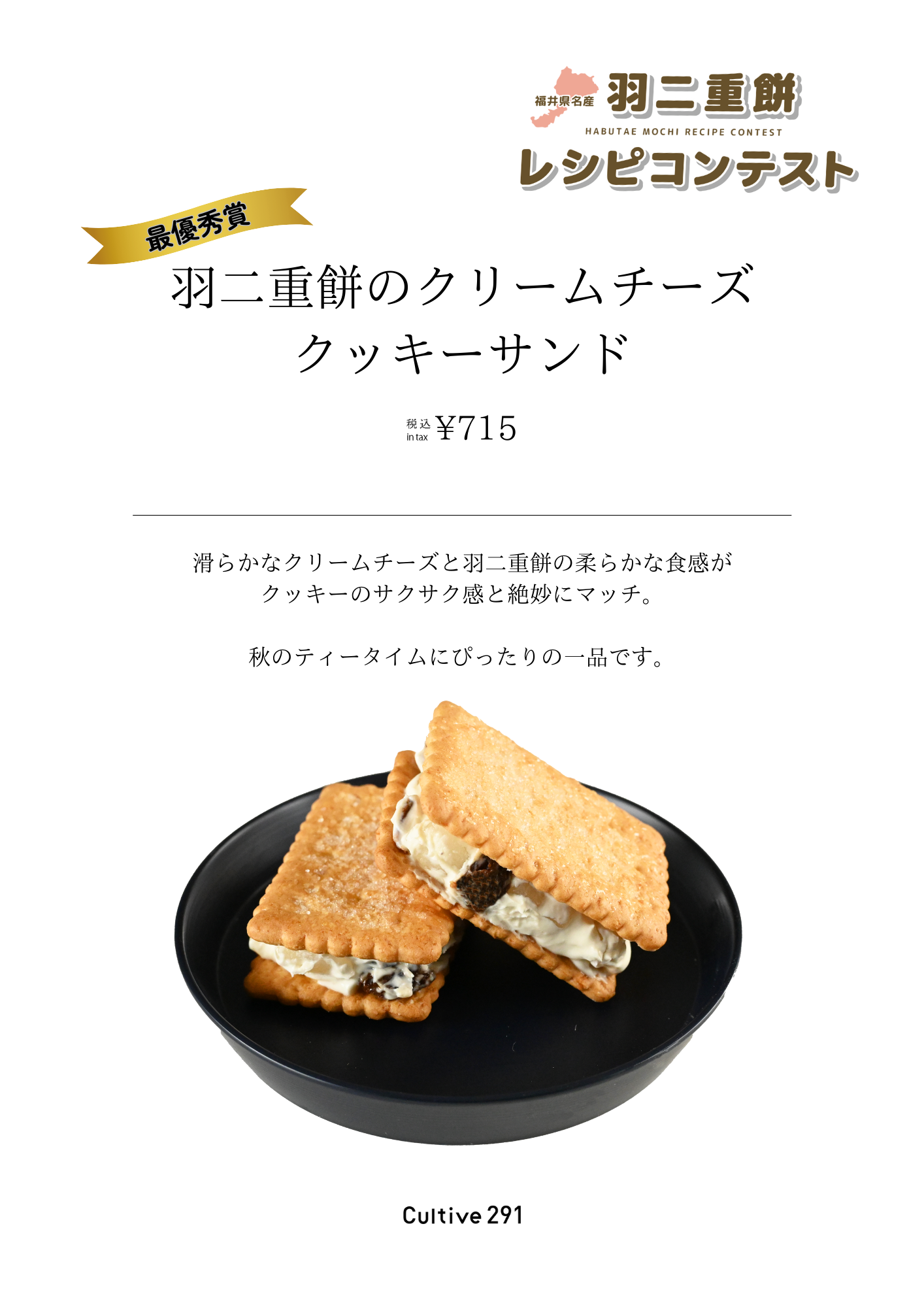 ふくい南青山291と福井の銘菓「羽二重餅」を使用した新しいレシピを募集する「羽二重餅レシピコンテスト」において最優秀賞となりましたメニューをCultive291にて期間限定メニュー化させていただきます。